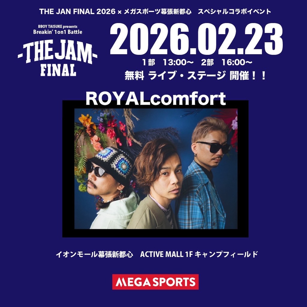THE JAM2026 LIVE EVENT ライブ 2026 年 2 月 23 日 (月) 開催日 2026 年 2 月 23 日 (月) アーティスト ROYALcomfort イベント概要 THE JAM FINAL 2026 にて 02.23(日)ROYALcomfort Free LIVE!! が決定しました🔥 会場は イオンモール幕張新都心 ACTIVE MALL 1F キャンプフィールド。 入場無料でどなたでもご観覧いただけます。 出演者情報 ROYALcomfort 戻る
